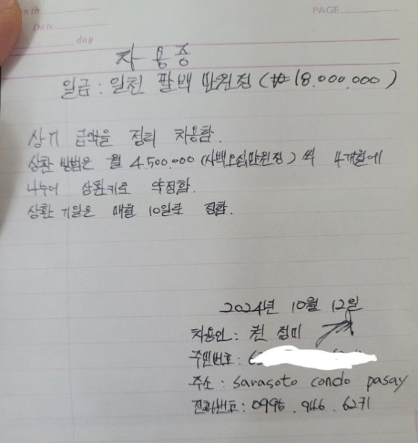 필리핀 사기꾼 추가 배째라 합니다 독고다이 2025-09-22 14:26 302 0 0 - 첨부파일 : 필리핀사기꾼.jpg (48.2K) - 다운로드 7 2025-09-22 14:26:53 - 첨부파일 : 필리핀사기꾼1.jpg (95.7K) - 다운로드 6 2025-09-22 14:26:53 - 별점 : 평점 - [ 0점 | 참여 0명 ] 이전글 다음글 목록 답변 본문 어떡해 해야 할까요? 0 로그인 후 추천 또는 비추천하실 수 있습니다. 댓글목록0 등록된 댓글이 없습니다. 댓글쓰기 댓글 포인트 안내 이름 필수 비밀번호 필수 비밀글 사용 첨부파일 동영상 이모티콘 적용하기 * 지원 동영상 서비스 목록 보기 지원 동영상 서비스 목록 서비스명URL 주소 유튜브https://www.youtube.com 비메오https://vimeo.com 네이버 TVhttp://tv.naver.com 카카오 TVhttps://tv.kakao.com 테드https://www.ted.com 판도라http://www.pandora.tv 데일리모션https://www.dailymotion.com 슬라이더쉐어https://www.slideshare.net 유쿠http://www.youku.com iQiyihttp://www.iqiyi.com 자동등록방지 자동등록방지 숫자음성듣기 새로고침 자동등록방지 숫자를 순서대로 입력하세요. 댓글등록 댓글 포인트 안내
