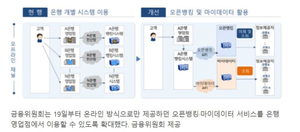 금융위원회는 이날부터 웹·모바일 등 온라인 방식으로만 제공하던 오픈뱅킹·마이데이터 서비스를 은행 영업점에서